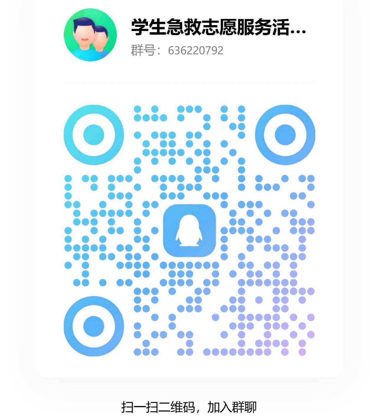 3. 全程参加培训、考核合格且参与急救志愿服务的学生可获得相应志愿服务时长证明。可扫码加入“学生急救志愿服务活动群”,关注群活动消息。