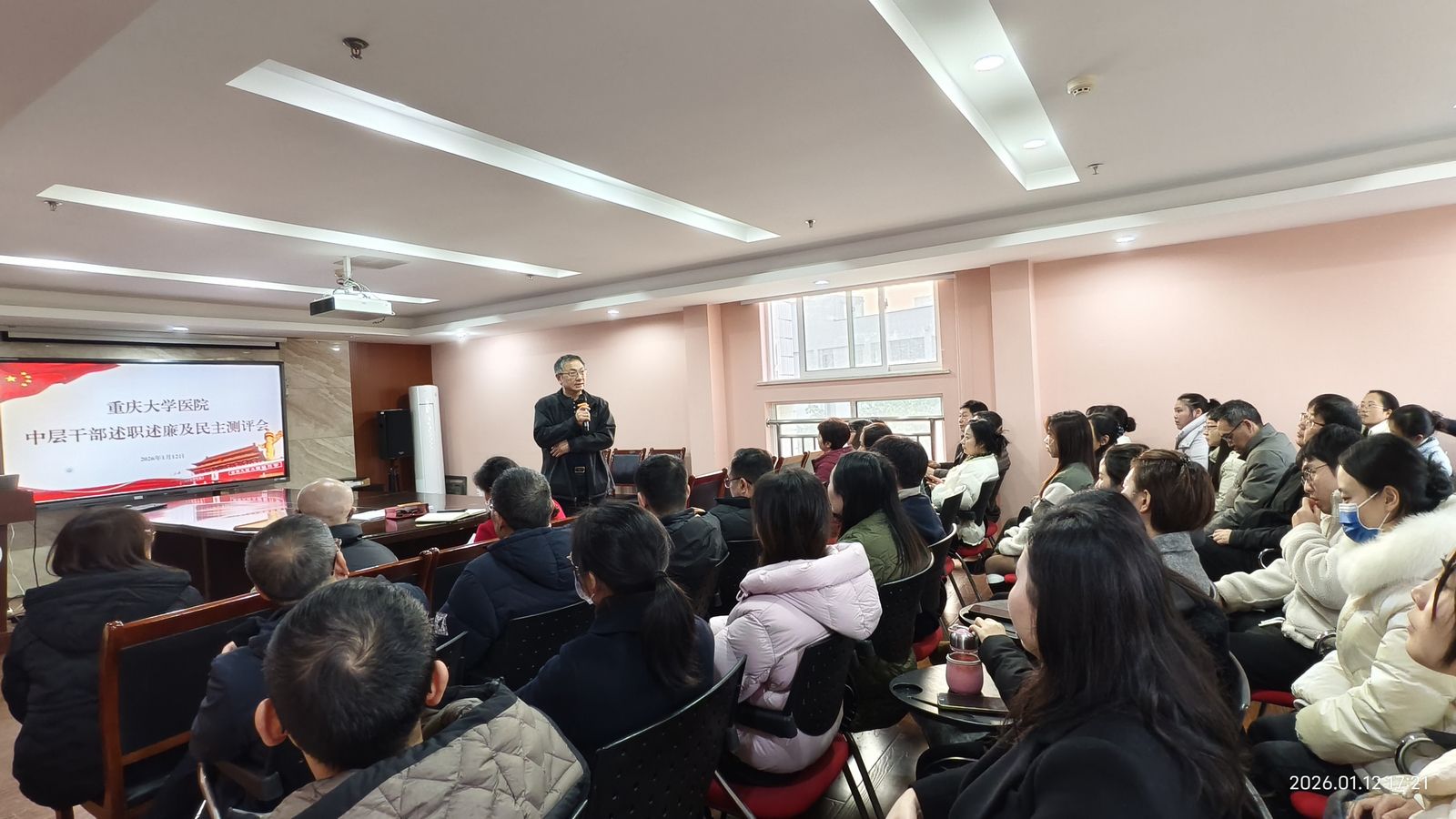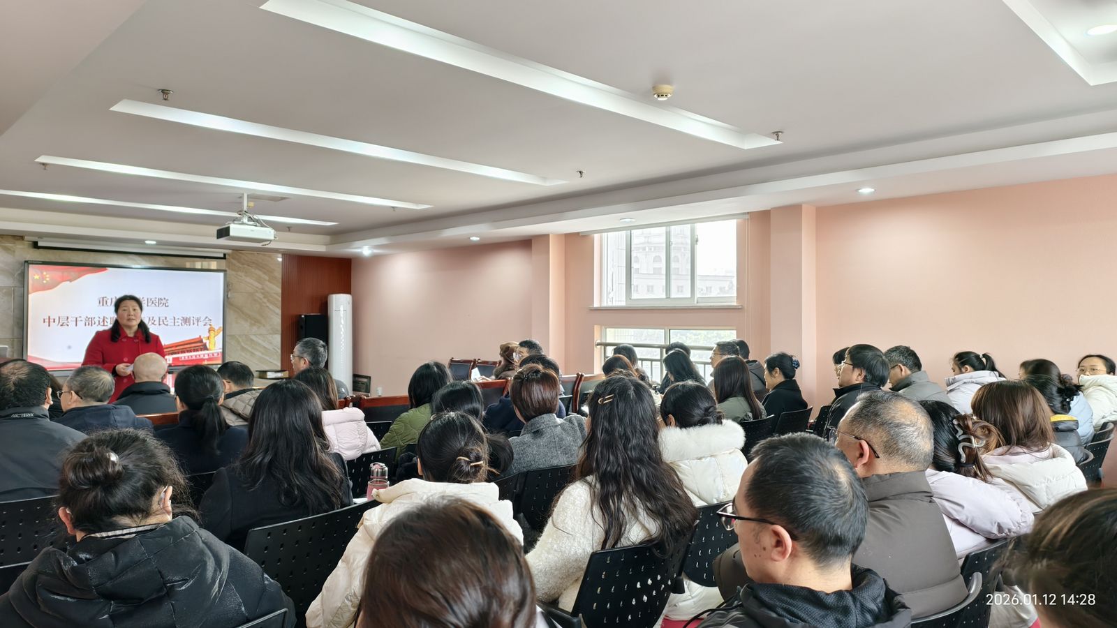 为总结一年的工作,全面、客观、准确地评价医院中层管理干部履职尽责情况,进一步激发干部队伍干事活力,2026年1月12日下午,医院在A校园5楼会议室召开2025年干部年度考核述职暨民主测评会。医院领导、各科室负责人、各党支部书记、职工代表等80余人参加会议。会议由医院党总支书记李华主持。