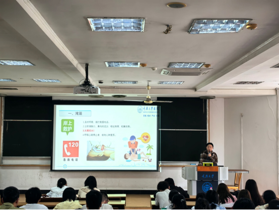 讲座由校医院李迪婧医师担任主讲。李迪婧紧密结合当前学生生活实际与校外实践场景,针对淹溺、烧烫伤、电击伤、中暑等日常生活中常见且易发的意外伤害情况,进行了系统、专业的讲解。在授课过程中,她详细剖析了各类意外伤害的发生机制与潜在危险因素,并将授课重心精准落位于“实用、管用”的应急处置方法上。